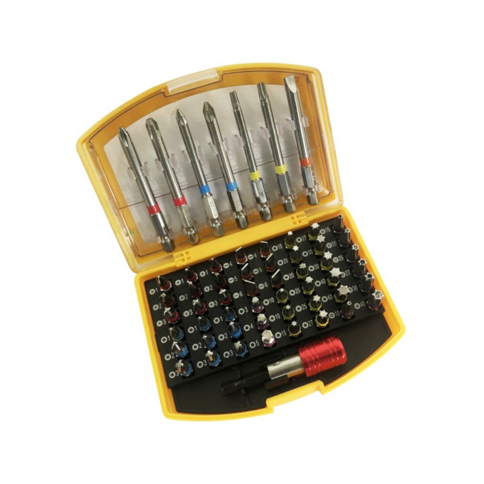 • Bitkészlet 56 db-os • 25 mm bid: PH 1, 2, 3 – 3x PZ 1, 2, 3 – 3x SL 4.0, 5.0, 6.0 T 10, 15, 20, 25, 27, 30, 40 – 2x TR 10, 15 , 20, 25, 27, 30, 40 H 3.0, 4.0, 5.0 • 75 mm bid: PH 2, 3 PZ 1, 2 SL 6.0 mm T 20, 25