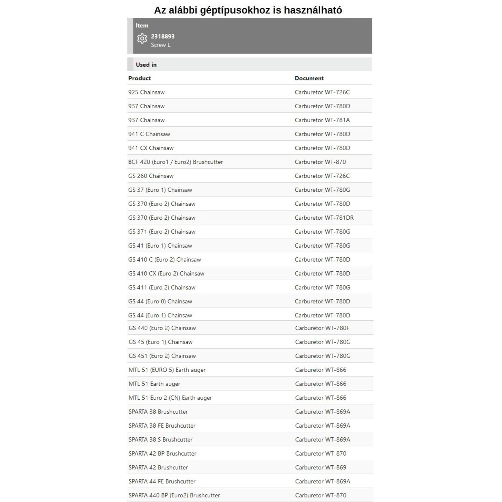 Tipusok: 925, 937, 941 C-CX, BCF 420, GS 260, GS 37 - 370 - 371, GS 41 - 410 C-CX, GS 411 - 44 - 440 - 45 - 451, MTL 51, Sparta 38 - 42 - 44 - 440,