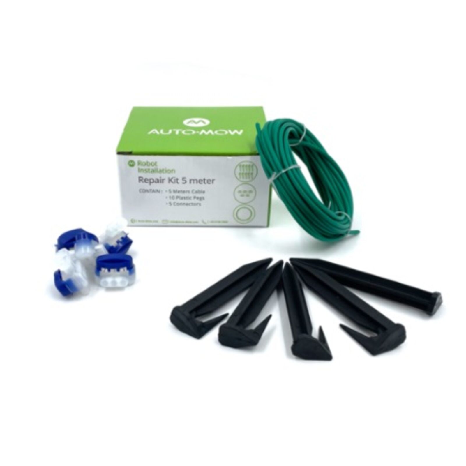 Az Auto-Mow javítókészlet tökéletes választás a sérült határoló vezeték javításához és a munkaterületen végzett kisebb igazításokhoz. Tartalmaz 25 méter 2,7 mm vastag határoló vezetéket, 10 rögzítő tüskét és 5 csatlakozót, amellyel a meglévő vezetékhez könnyedén új vezetékszakasz csatlakoztatható. Használható minden típusú Husqvarna Automower robotfűnyíróhoz:105 305 308 310 315 315X 320 330X 420 430X 435X AWD 440 450X 520 535AWD 550 G2 G3 210C 220AC 230ACX 260ACX 265ACX SH Solar Hybrid Használható minden típusú Gardena robotfűnyíróhoz:R38Li R40Li R45Li R50Li R70Li R75Li R80Li R100Li R130Li R160Li R165 R180 Sileno Sileno+ Sileno City smart Sileno City smart Sileno smart Sileno+ Minimo Használható minden típusú McCulloch robotfűnyíróhoz:ROB S600 R600 R1000 Használható minden típusú Robomow robotfűnyíróhoz:MC300 MC500 MC1000 MC1200 MS-Serie RL-series RM-Series MS-széria RL-széria RM-széria RC304u RC380u RS615u RX12u RX50u Connect Használható minden típusú Bosch robotfűnyíróhoz:Indego S+ 350 M+ 700 M700 800 1000 1100 1200 connect Használható minden típusú WolfGarten robotfűnyíróhoz:Loopo M1000 M1500 M2000 S150 S300 S500 Connect Használható minden típusú Ambrogio robotfűnyíróhoz:L200 L250 L15 L60 Elite Típusok: Auto-Mow: