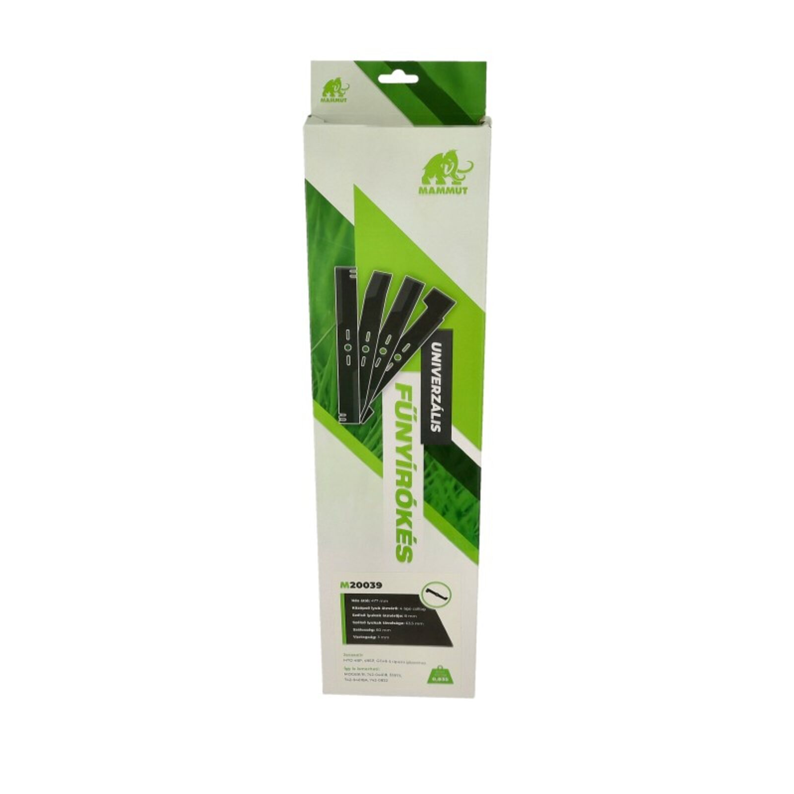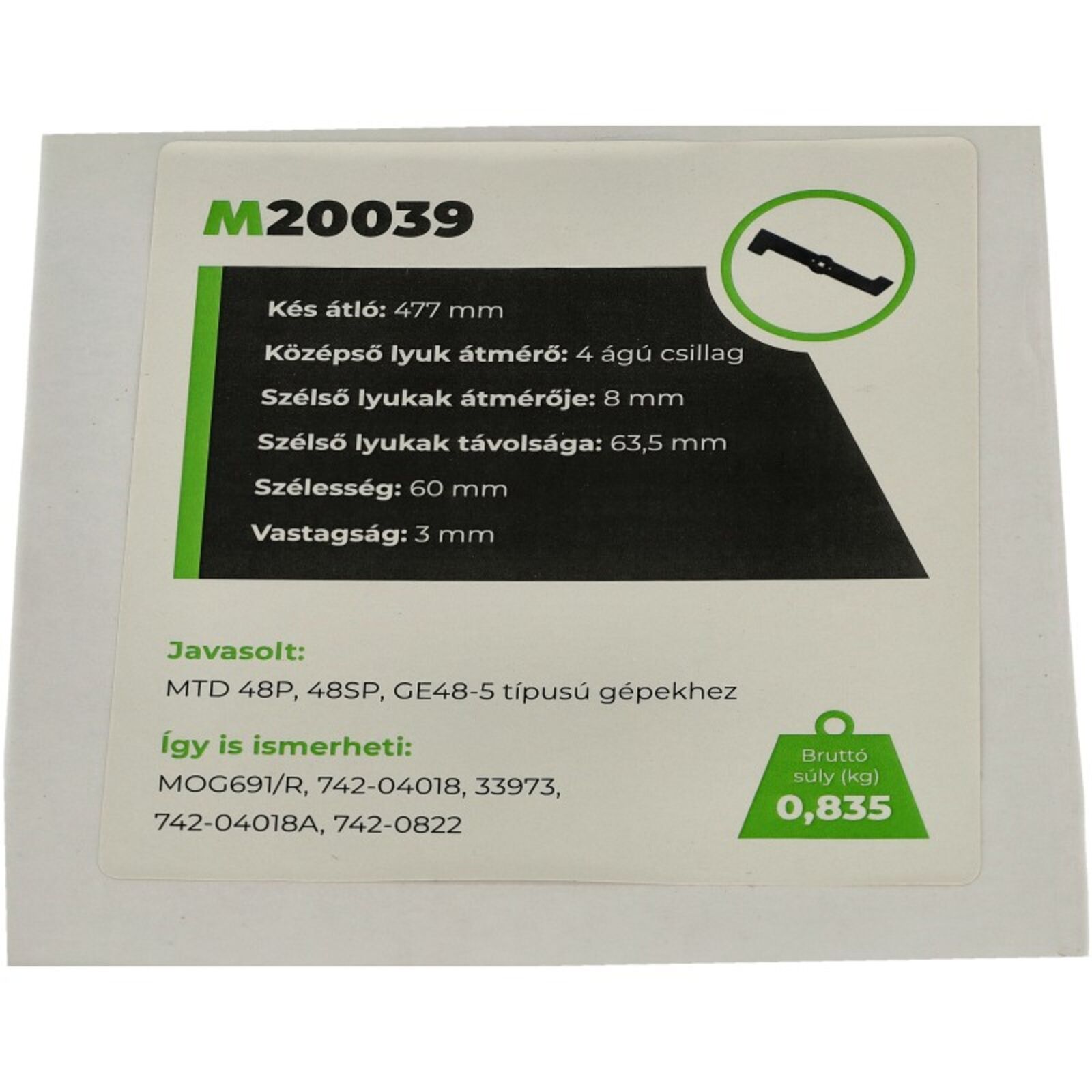 MTD 48P, 48SP, GE48-5 típusú géphez fűnyírókés. Eredeti gyári cikkszám: 742-04018, 33973, 742-04018A, 742-0822 Kés átló:477mm Hossz:476mm Középső lyuk átmérő:4 ágú csillag Szélső lyukak átmérője:8mm Szélső lyukak távolsága:63,5mm Szélesség:60mm Vastagság:3mm Típusok: MAMMUT: MTD 48P, MTD 48SP, MTD GE48-5,