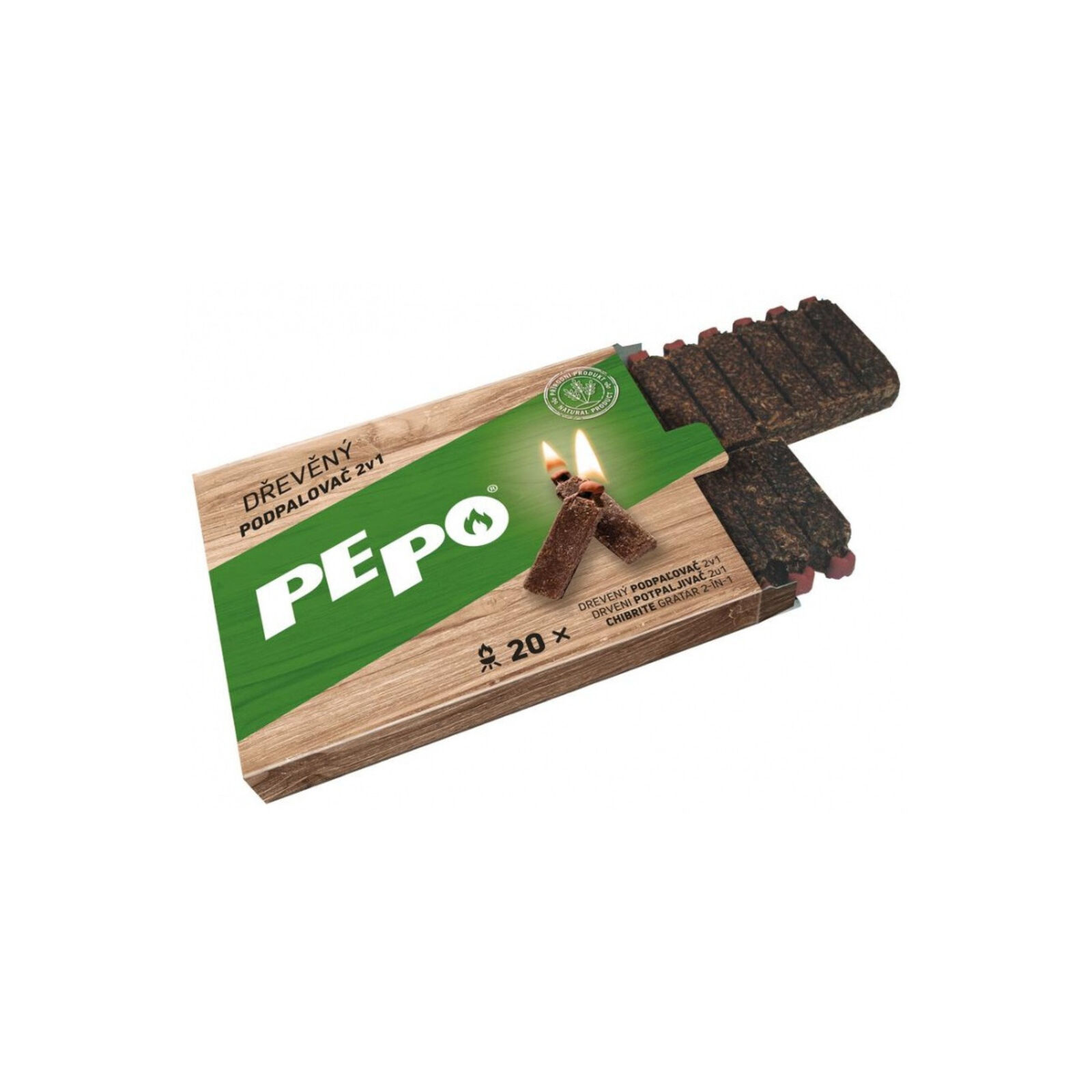 A PE-PO fa öngyújtó 2 az 1-ben, szétválasztható részek formájában, paraffinnal impregnált préselt faforgácsot tartalmaz, és a végén gyufával van ellátva. A gyújtófej a doboz részét képezi. Érdekes alternatíva a klasszikus szilárd vagy folyékony gyújtókhoz. - egyszeru, gyors és biztonságos használat, 2 az 1-ben rendszer - 15 percig ég - szagtalan - nyitott tuzhelyeken, kandallóban és grillen használható - beltéri használatra alkalmas - a csomag 20 db gyújtót tartalmaz Termék PE-PO fa gyújtó 2 az 1-ben elnyerte a Consumers' Choice 2010 - Legjobb újdonság díjat a Gyújtók és brikett kategóriában, valamint a zsuri díját, mint a legnagyobb innováció a nem élelmiszerjellegu termékek közül !!!
