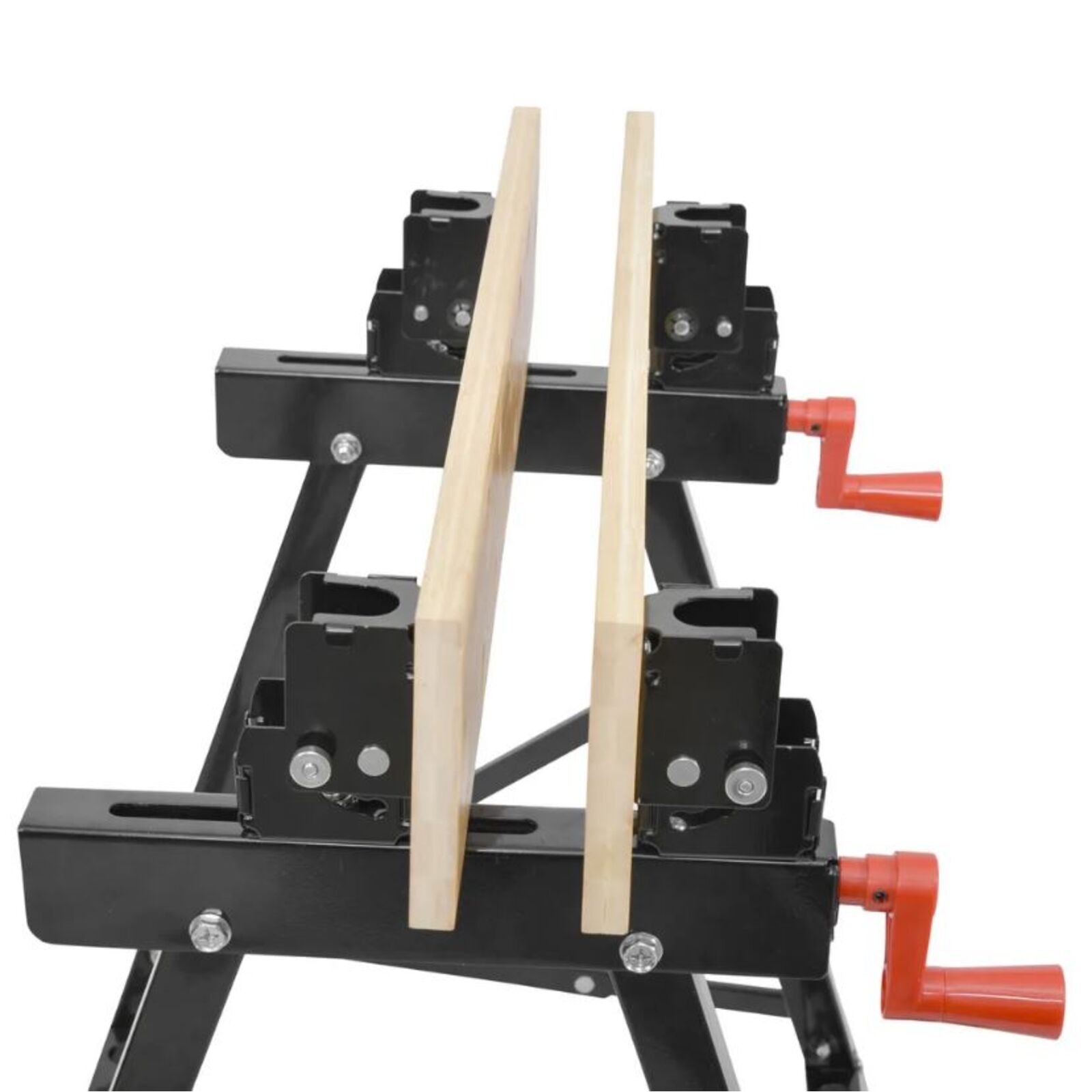 A bilincsek több helyen rögzíthetők az előkészített furatokban. Az anyag szorosan meghúzható és a fogantyúk segítségével rögzíthető az asztalhoz. Az asztal így ideális segédeszköz például deszkák, gerendák stb. megmunkálásakor.