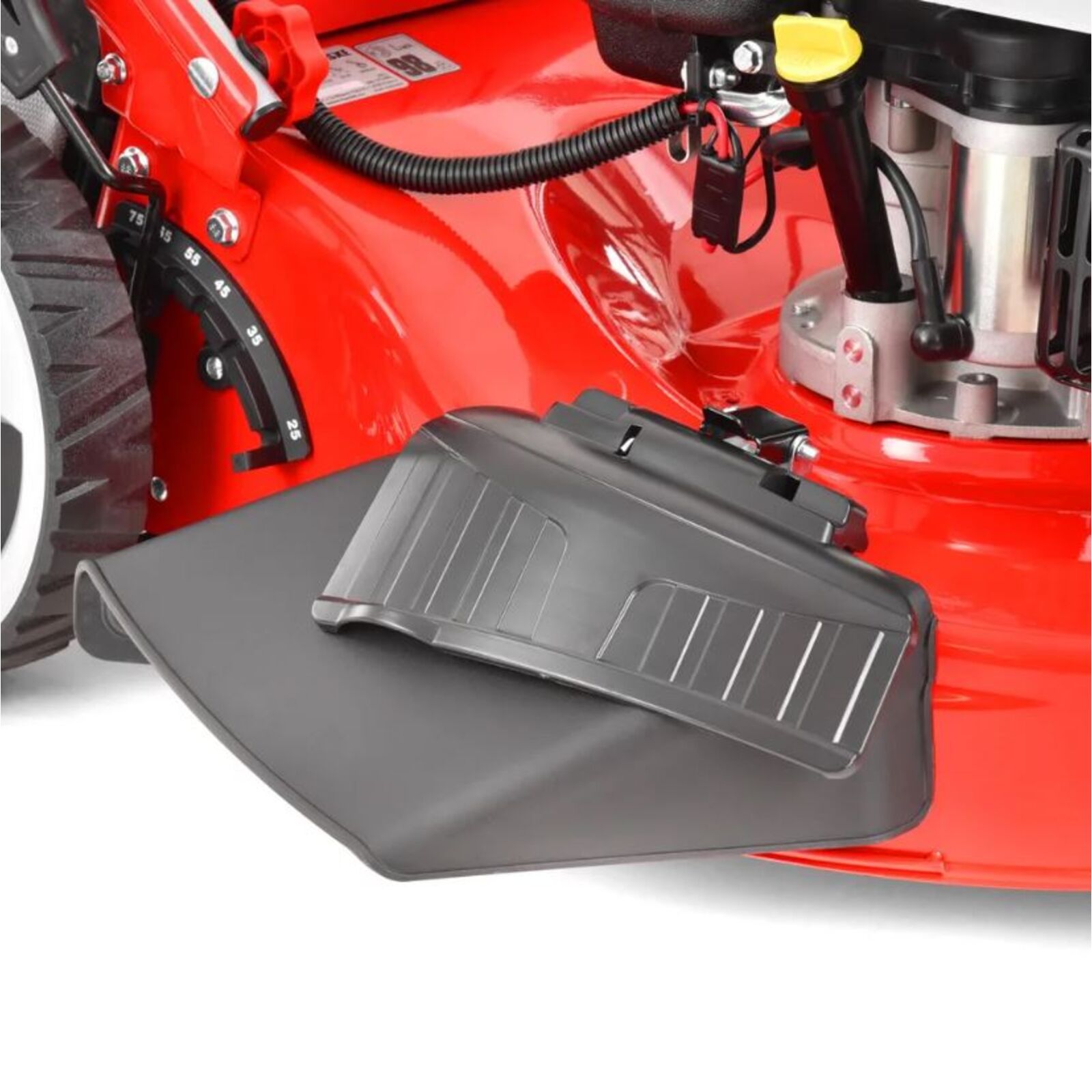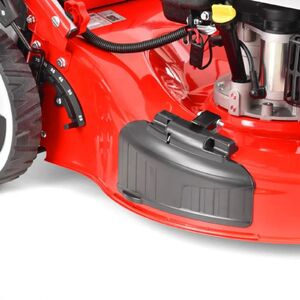 A fűnyíró tartozéka még az oldalkidobó burkolat és a mulcsozó ék. Elég levenni a gyűjtőkosarat, a hátsó kidobónyílásba beilleszteni a mulcsozó éket. és a speciális késeknek köszönhetően a fűnyíró készen áll a mulcsozásra. A mulcsozás folyamán a fű finom darabokra van összevágva, amelyek szabadon lehullanak a fű gyökeréhez. A finom összevágásnak köszönhetően megtartják a talajban a nedvességet és természetesen táplálják a talajt. Ha az ékkel együtt felteszi az oldalkidobó burkolatát is, a füvet az oldalkidobó használatával tudja vágni. Ez akkor előnyös, ha a levágott füvet nem szeretné összegyűjteni, és így a nagyra nőtt füvet is le tudja vágni.