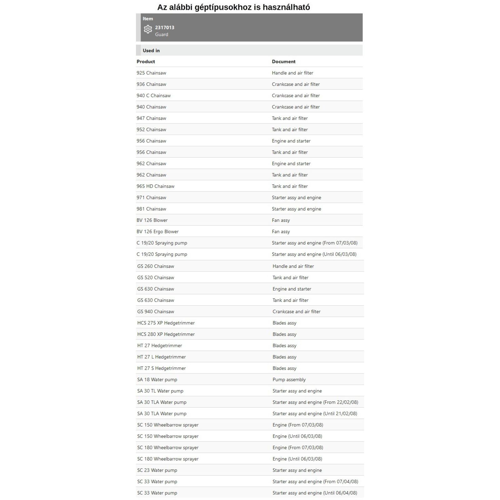 Tipusok: 925, 936, 940, 940 C, 947, 952, 956, 962, 965 HD, 971, 981, BV 126, C 19/20, GS 260, GS 520, GS 630, GS 940, HCS 275 XP, HT 27, SA 18, SA 30, SC 150, SC 180, SC 23, SC 33