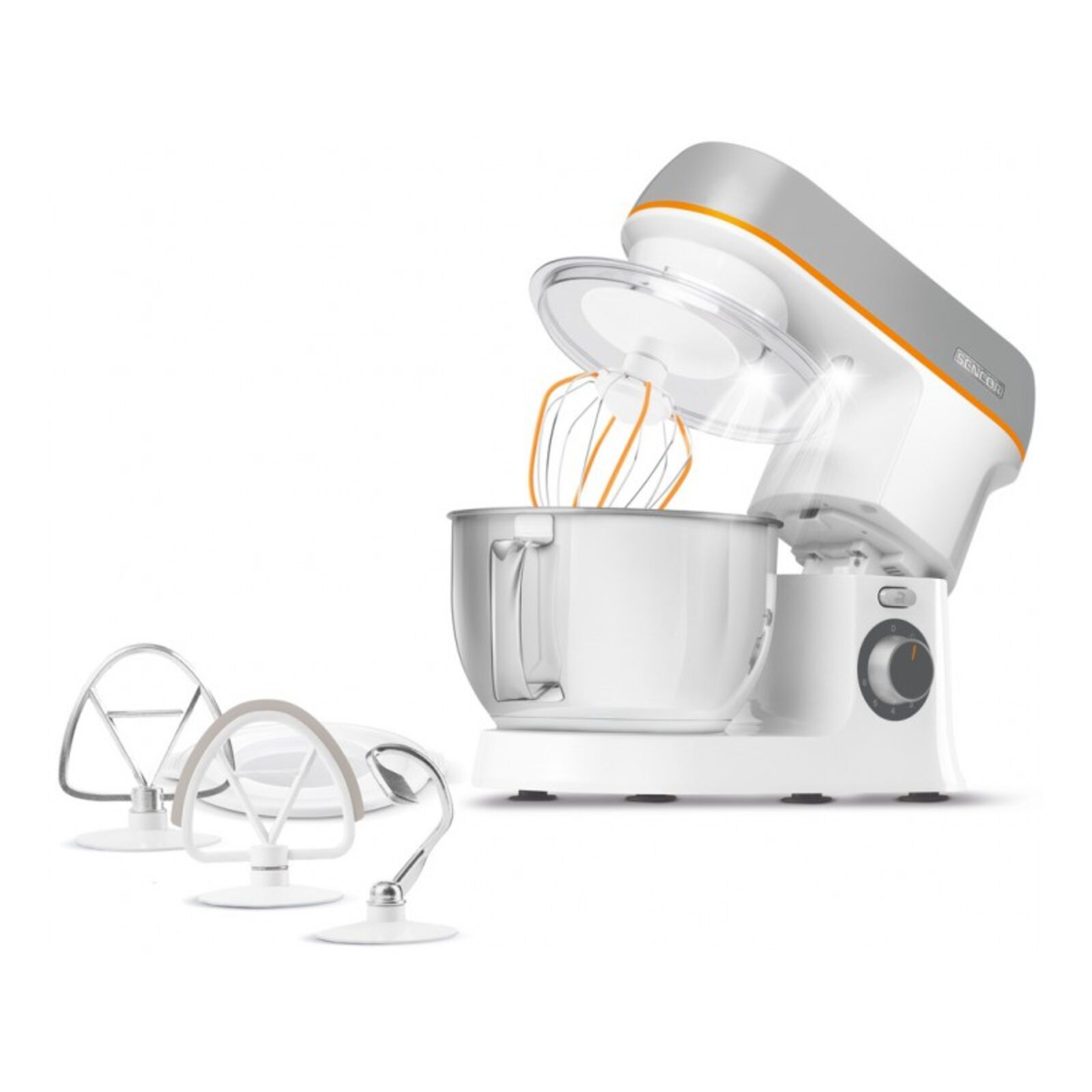 Nagyteljesítményű motor, 1000 W Sencor Smart Power & Energy – biztosítja az optimális fordulatszámot Sebességfokozatok száma: 6 4 l-es rozsdamentes acél edény, térfogat skálával 4 keverőszár: dagasztáshoz, habveréshez és könnyű tészták keveréséhez Speciális FLEXI keverő a finom tésztákhoz és krémekhez A speciális FLEXI habverővel egy tojás is kikeverhető LED világítás a keverő edénynél