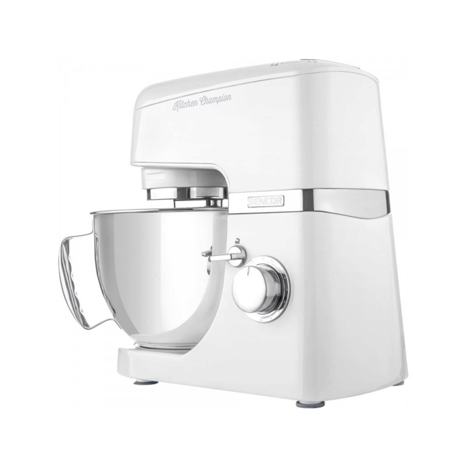 Sencor Smart Power & Energy - az optimális sebesség érdekében LED világítás a keverő edénynél,Impulzus funkció Átlátszó fedél a hozzávalók mixelés közbeni hozzáadására szolgáló nyílással Rozsdamentes acél keverőtál műanyag tároló fedéllel A bajonettzáras rögzítőrendszer lehetővé teszi a gyors összeállítást Rögzítő biztonsági zár a lengőkar felső állásában Dagasztó horog, A-betű formájú habverő, gömb alakú habverő 1,5 literes üvegmixer,Húsdaráló durva és finom daráláshoz 2 különböző átmérőjű kolbásztöltő feltéttel 4,5 literes rozsdamentes acél dagasztótál mérőskálával