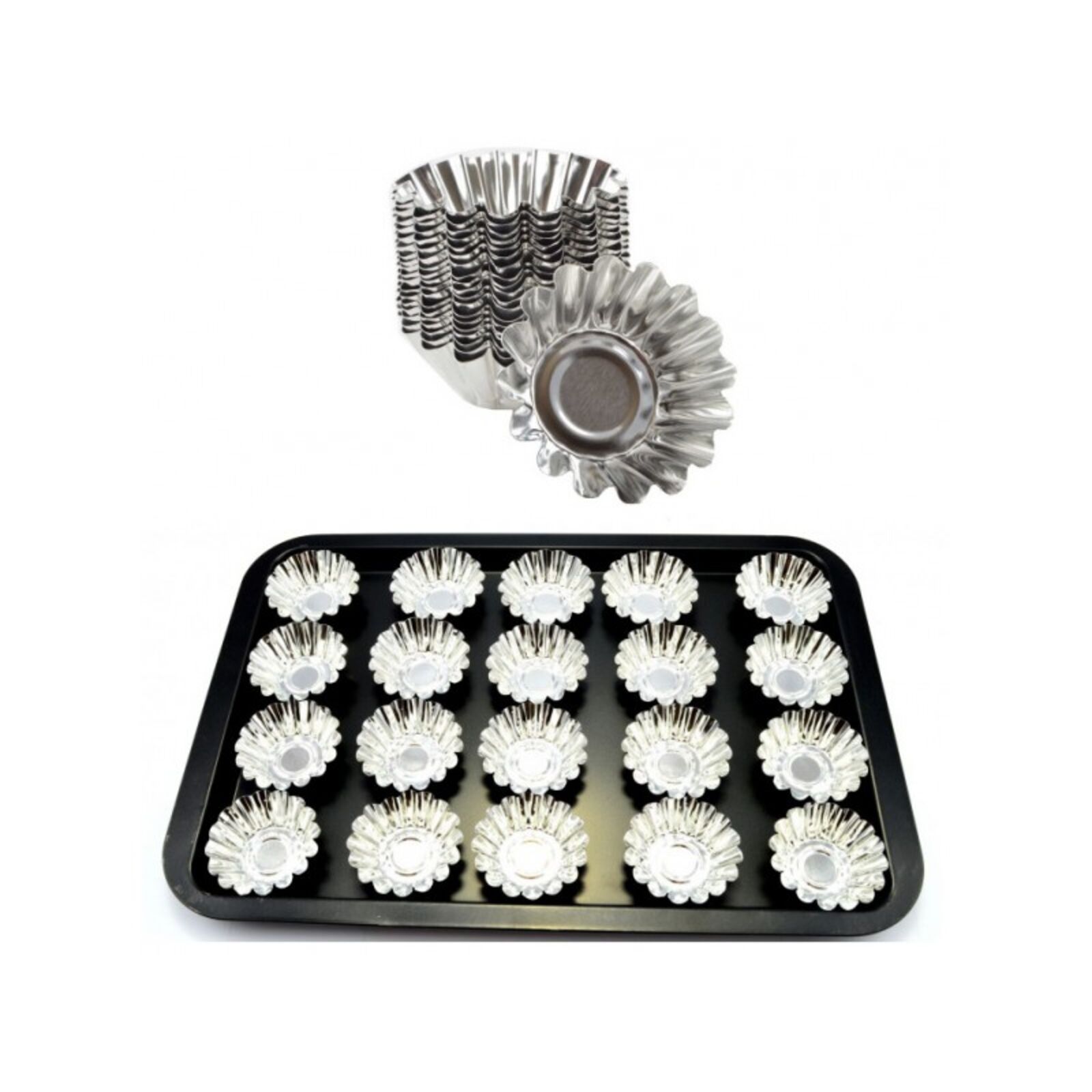 Anyaga: ónozott lemez Tartalma: 20 db egyforma méretű sütiforma Mérete: 6,5 cm átmérőjű, 2,5 cm magas