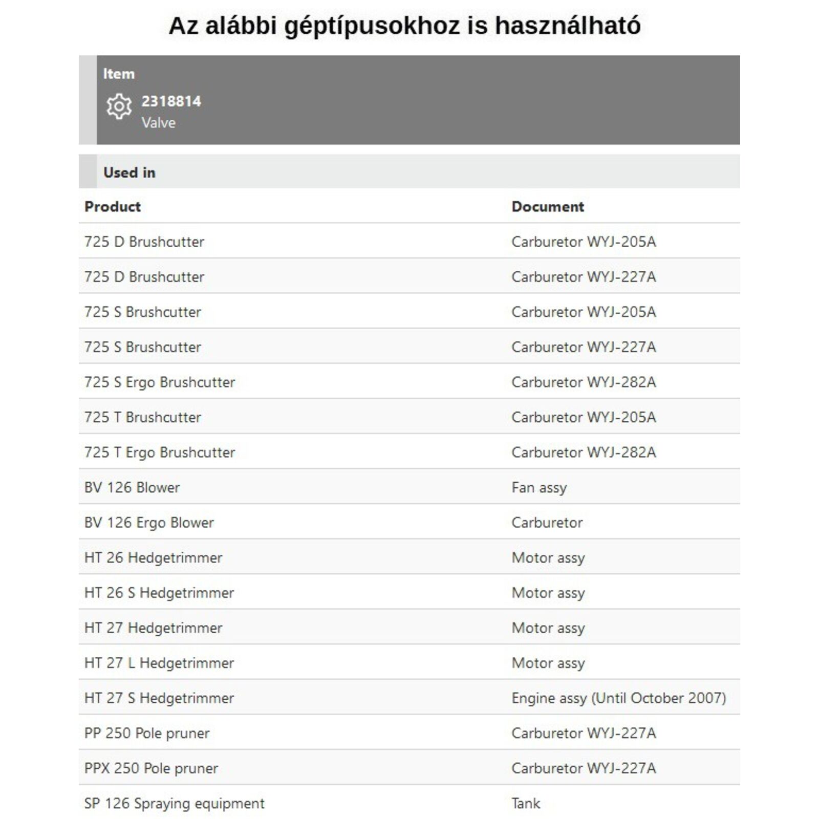 Tipusok: 725, BV126, HT26, HT27, SP126, PPX 250,