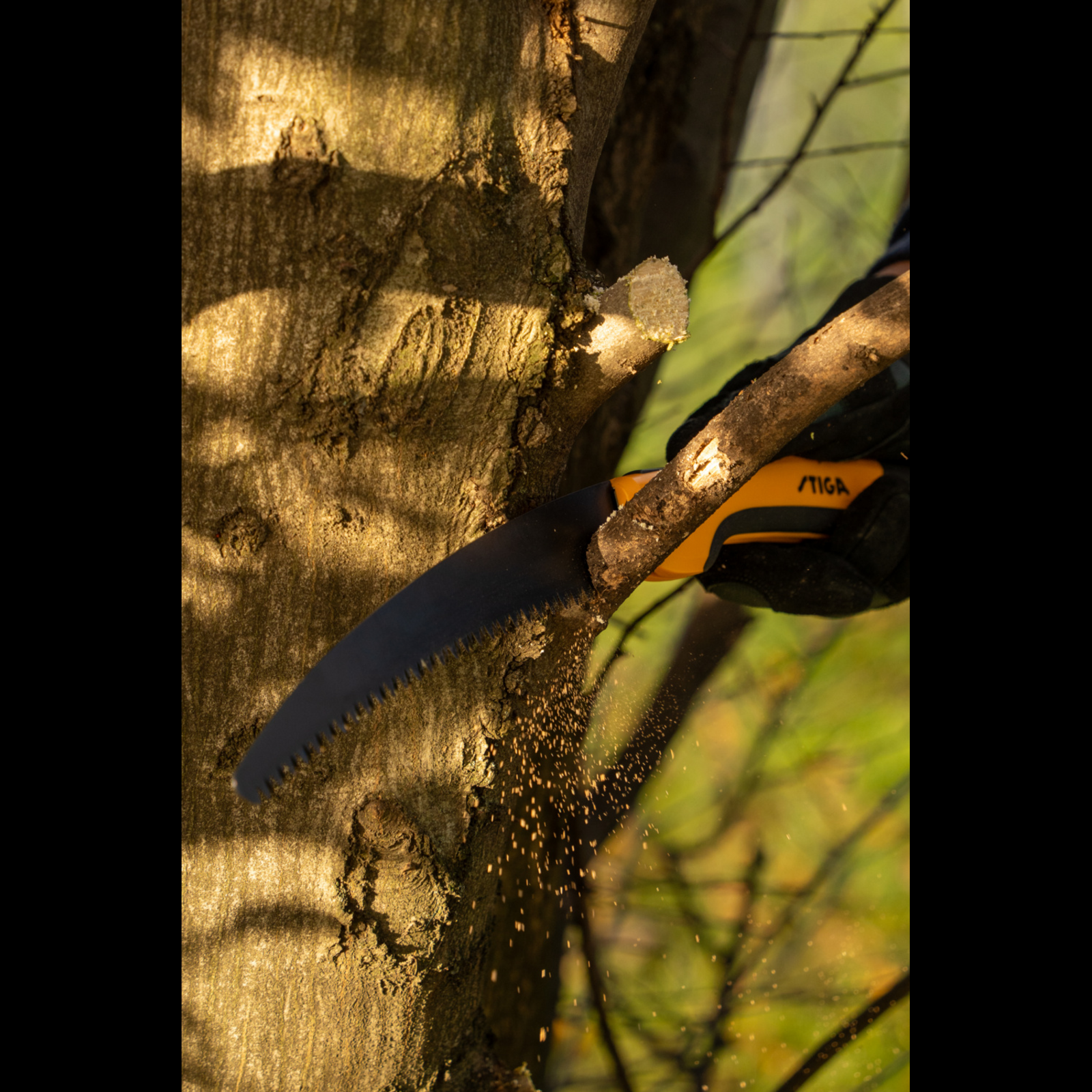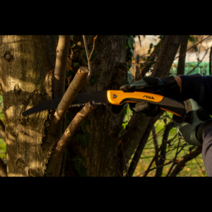 Ez a STIGA összecsukható metszőfűrész ívelt pengével, háromszoros csiszolású fogakkal és tapadásmentes bevonattal rendelkezik. Akár 150 mm átmérőjű száraz és elhalt faágakat is vág. A fogantyún található extra markolat jobb ergonómiát biztosít, míg a sárga színű kialakításnak köszönhetően könnyen észrevehető a fűben.