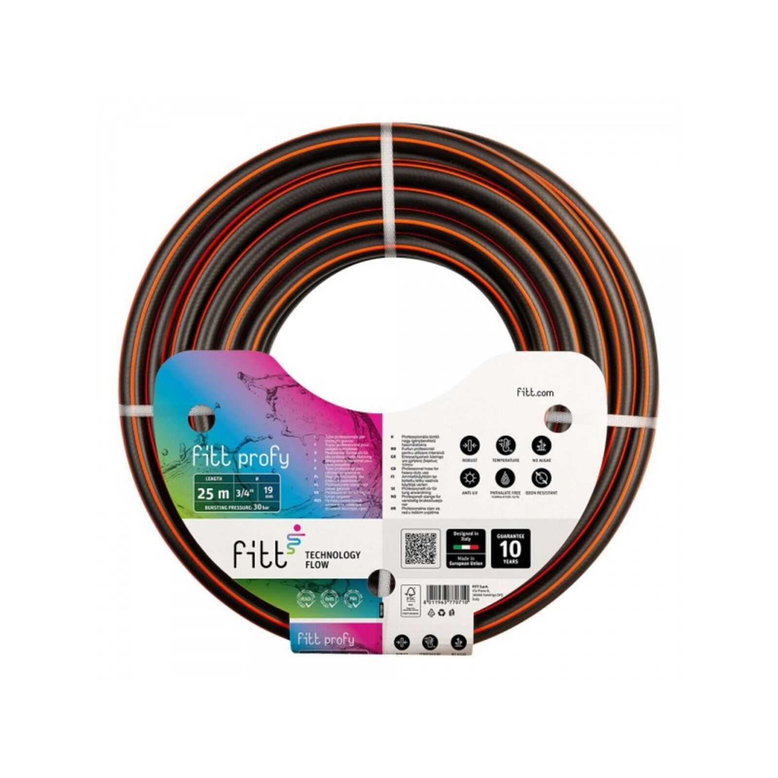 Professzionális felhasználásra 3 rétegű, szövött, a jó minőségű poliészter szálerősítés révén jól bírja a nyomást, hosszú élettartamot biztosít a tömlőnek. A tartós, nagy igénybevételt is jól tűrő tömlő ugyanakkor rugalmas, kellems tapintású és megjelenésű. 40 bar repesztő nyomást bír; Ellenáll az ózonnak, UV-stabil, algásodás mentes; -15 és +55 C°között használható; Ftalát mentes, REACH konfom ROHS konform, PAK mentes. Jól használható kertekben, építőiparban, hajók tisztításánál. A külső felület nagyon kopásálló. Belső átmérő: ?12 mm ( 1/2 COL 12,7000 mm ) Hossz: 25 méter Hő ellenállóság: -15C° / +55C°, UV álló Maximum nyomás: 40 Bar Külső réteg színe: fekete-narancs Belső réteg színe: fekete Anyag: rugalmas PVC Gyártó: FITT Ltd. - Made in Italia
