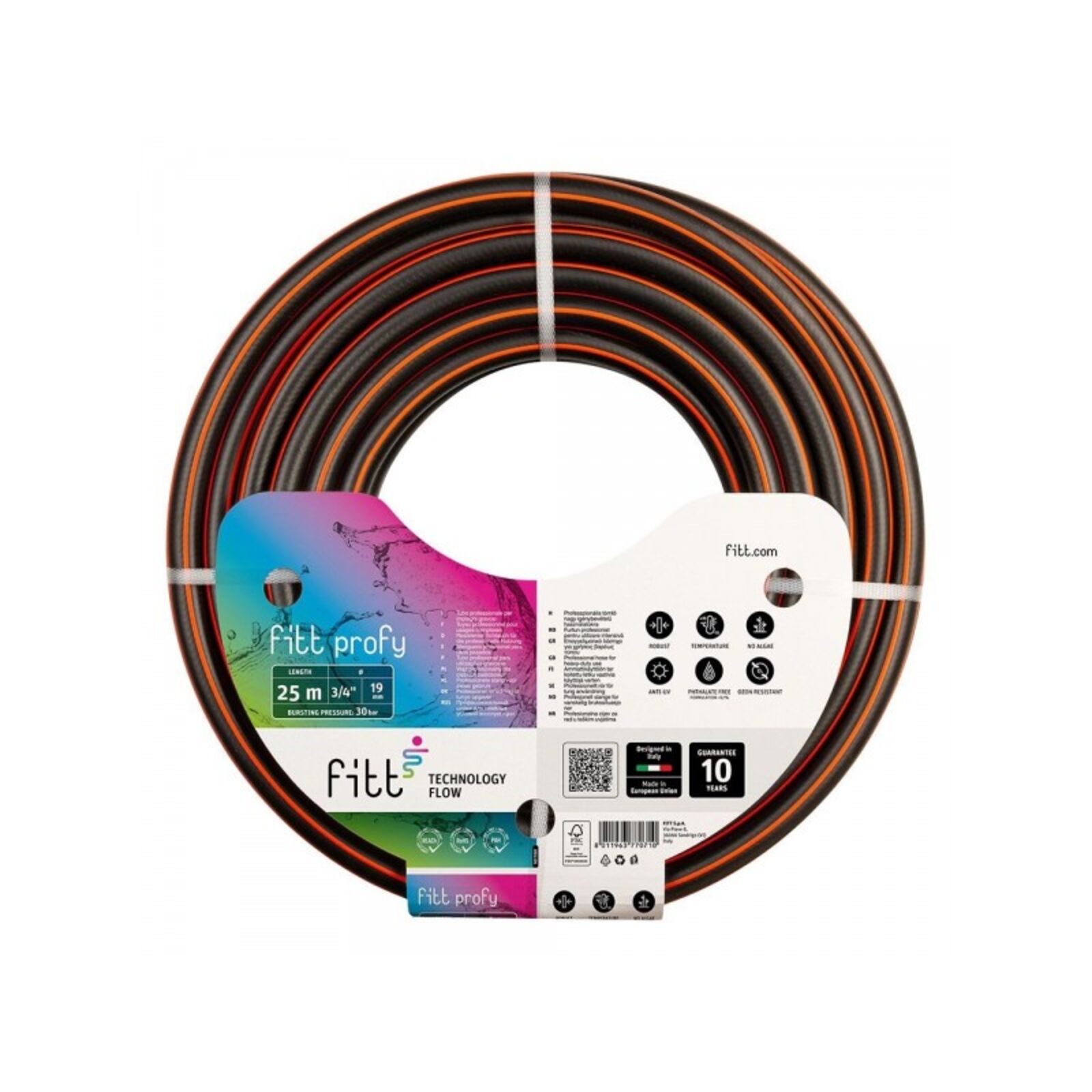 Professzionális felhasználásra 3 rétegű, szövött, a jó minőségű poliészter szálerősítés jó nyomásállóságot és hosszú élettartamot biztosít a tömlőnek. 30 bar repesztő nyomást bír; Ellenáll az ózonnak, UV-stabil, algásodás mentes; -15 és +55 C°között használható; Ftalát mentes, REACH konfom ROHS konform, PAK mentes. Belső átmérő:? 25 mm ( 1 COL 25,4000 mm ) Hossz: 25 méter Hő ellenállóság: -15C° / +55C°, UV álló Maximum nyomás: 30 Bar Külső réteg színe: fekete-narancs Belső réteg színe: fekete Anyag: rugalmas PVC Gyártó: FITT Ltd. - Made in Italia -